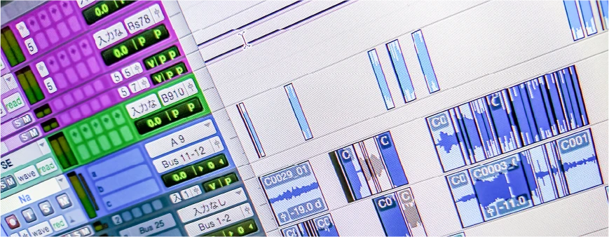 完成した映像にBGM・SE(効果音)・ナレーションを加え、音量やタイミングを調節します。これにより映像と音声の最終仕上げが完了し、マスター(原版)が完成します。